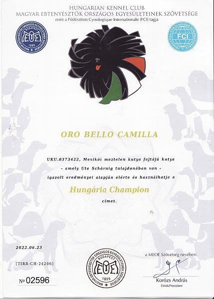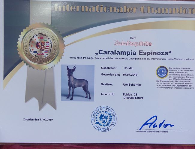 | Rasse: Xolo Standard Züchter: Dr. Hugo Fernando Gutierrez WT: 10.05.2009 Hündin ZTB bestanden ohne Einschränkung Landesjugendsiegerin Thüringen 2010 Deutscher Jugendchampion VDH Dt. Champion VDH Dt. Champion CER Exote par Excellence Veteranen Weltsieger 2017 Dt. Vet. Champion Veteranen-Bundessieger Titel und Dokumente: |