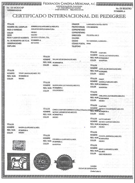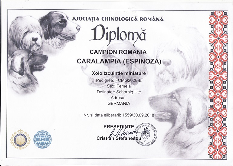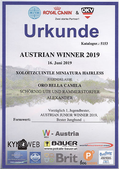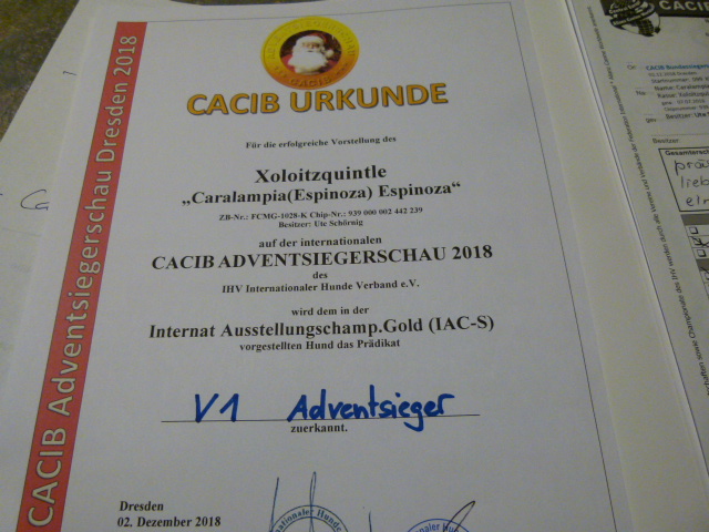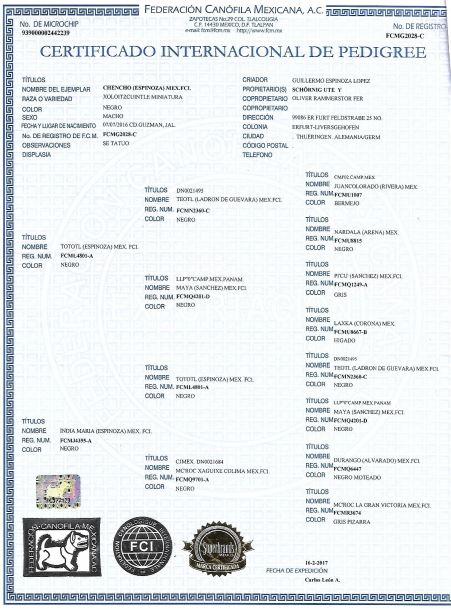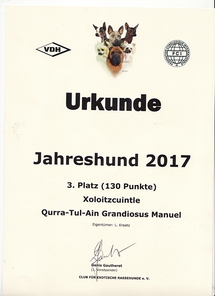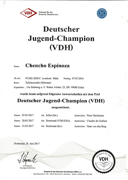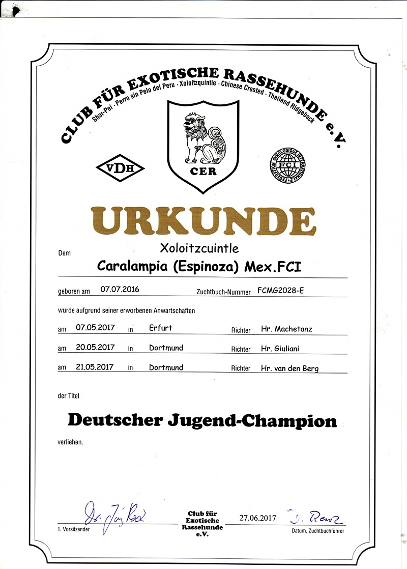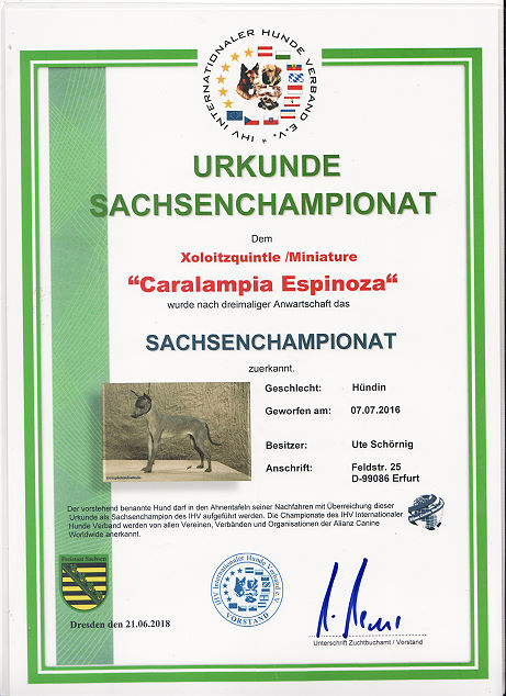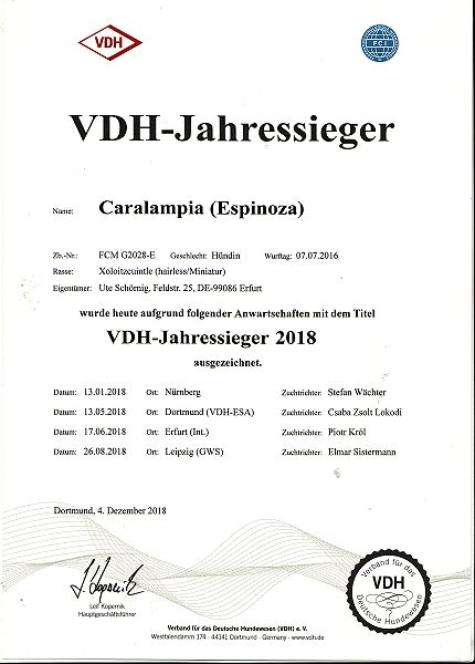 | Rasse: Xoloitczuintle Miniature Breeder: Guilermo Espinoza Owner: Ute Schörnig und Oliver Rammerstorfer geboren: 07.07.2016 PL-frei Junior World Winners 2017 and Best Junior of Breed Dt.Jug-Ch. VDH/CER Jun.-Lux.-Ch. Bundes-Jugendsieger VDH 2017 Dt. Ch. VDH Titel und Dokumente:
