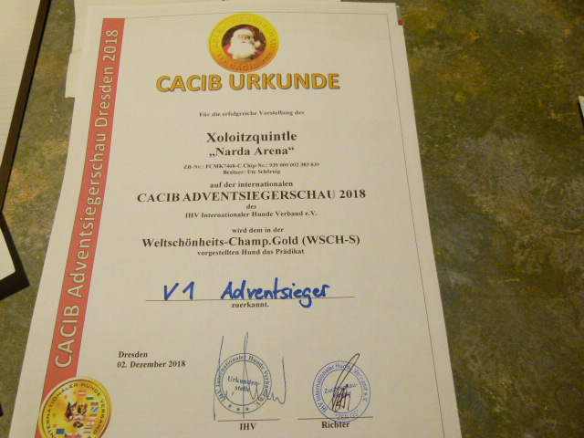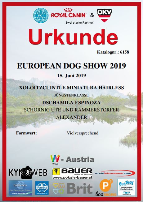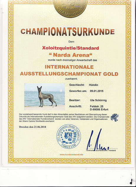 | Rasse: Xolo Standard Züchter: Alexandra Minoewa/Russland WT: 29.06.2013 ZTB ohne Auflagen Besitzer: Weber Jugendeuropasiegerin Jugendchampion VDH / CER Europajugendsiegerin 2014 Jugendclubsiegerin CER 2014 Jugenchampion Luxemburg Luxemburg Champion |