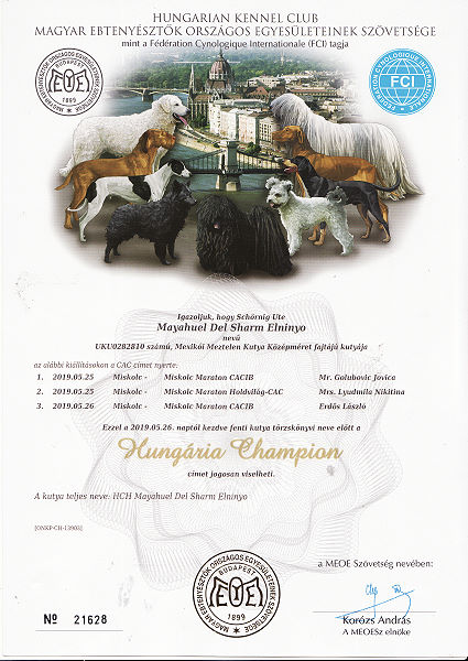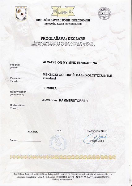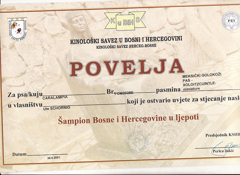 ![]() | Xoloitzcuintle Miniature Breeder: Ute Schörnig Owner: A.Rammerstorfer PL frei uneingeschränkt zuchttauglich CER Dt., Poln., Lux., Ung. Champion, Internat. Schönheits Ch. FCI Titel und Dokumente: | |