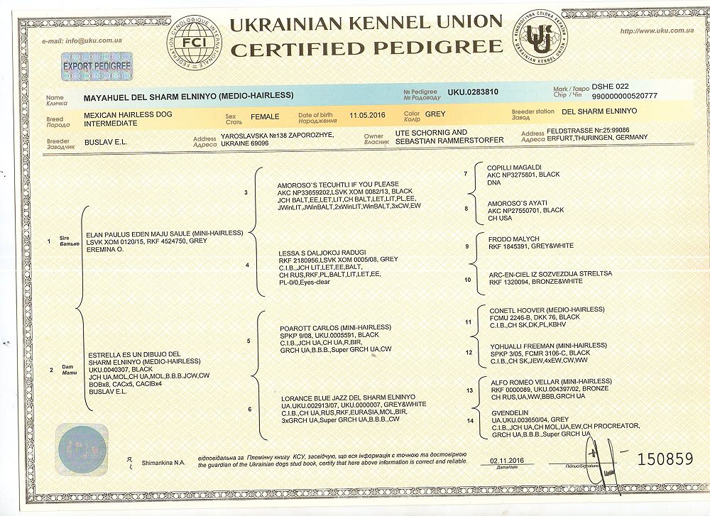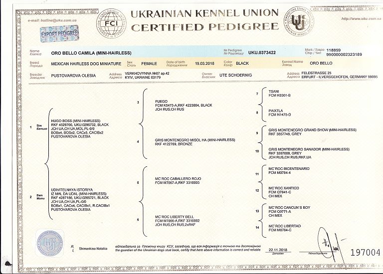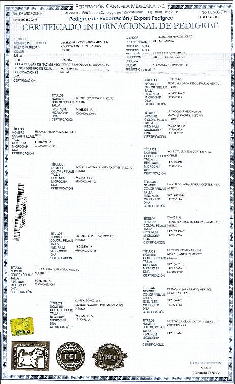 | Rasse: Xoloitzcuintle Miniature geb: 26.09.2018 Breeder: Guillermo Espinoza (Mexiko) Owner: Ute Schörnig Titel und Dokumente: