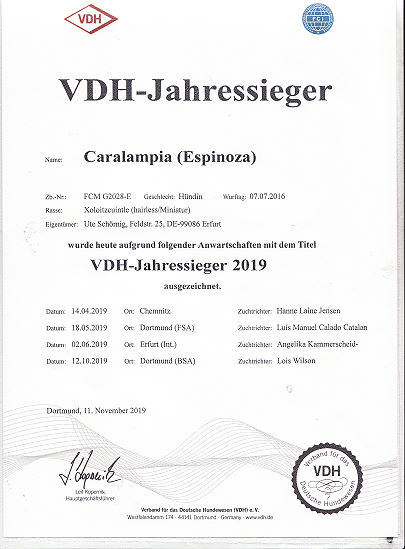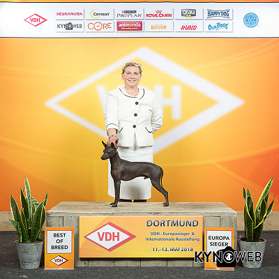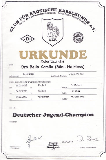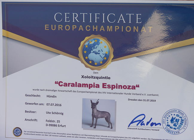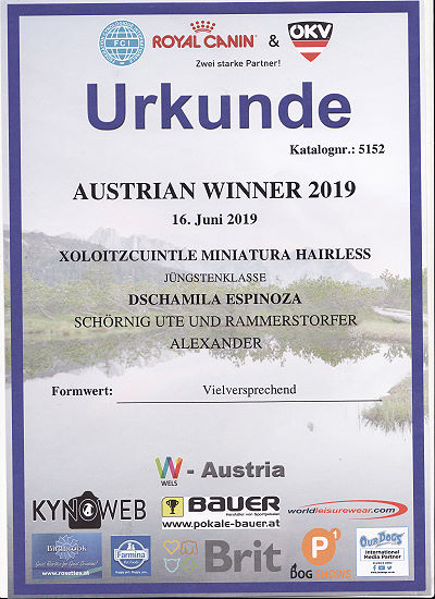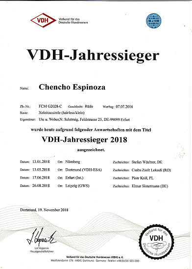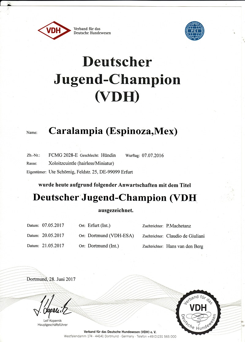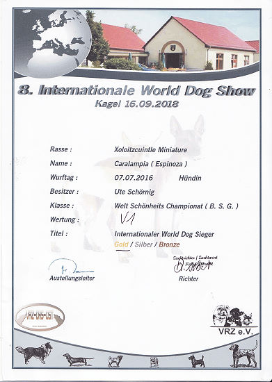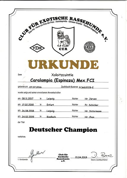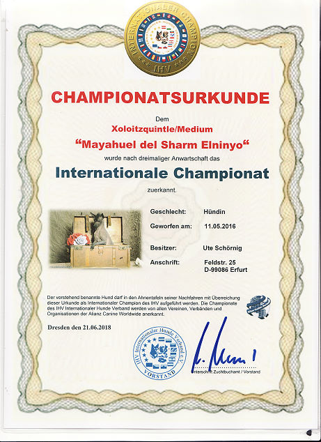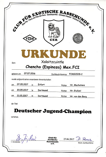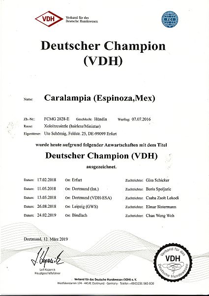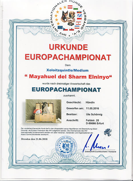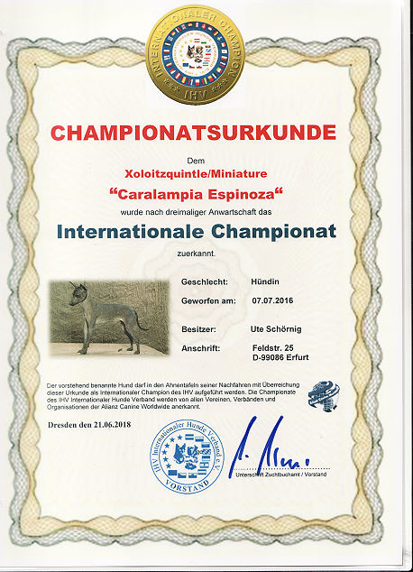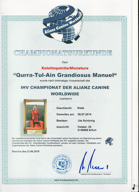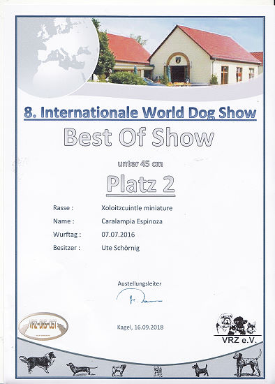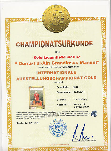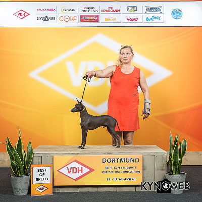 | Rasse: Xoloitczuintle Miniature Breeder: Guilermo Espinoza Owner: Ute Schörnig und Oliver Rammerstorfer geboren: 07.07.2016 PL-frei Junior World Winners 2017 and Best Junior of Breed Dt.Jug-Ch. VDH/CER Jun.-Lux.-Ch. Bundes-Jugendsieger VDH 2017 Dt. Ch. VDH Titel und Dokumente: