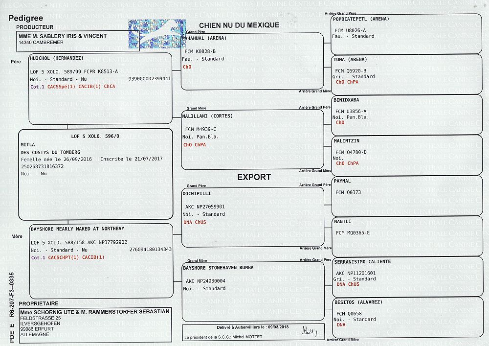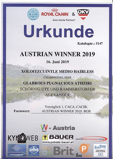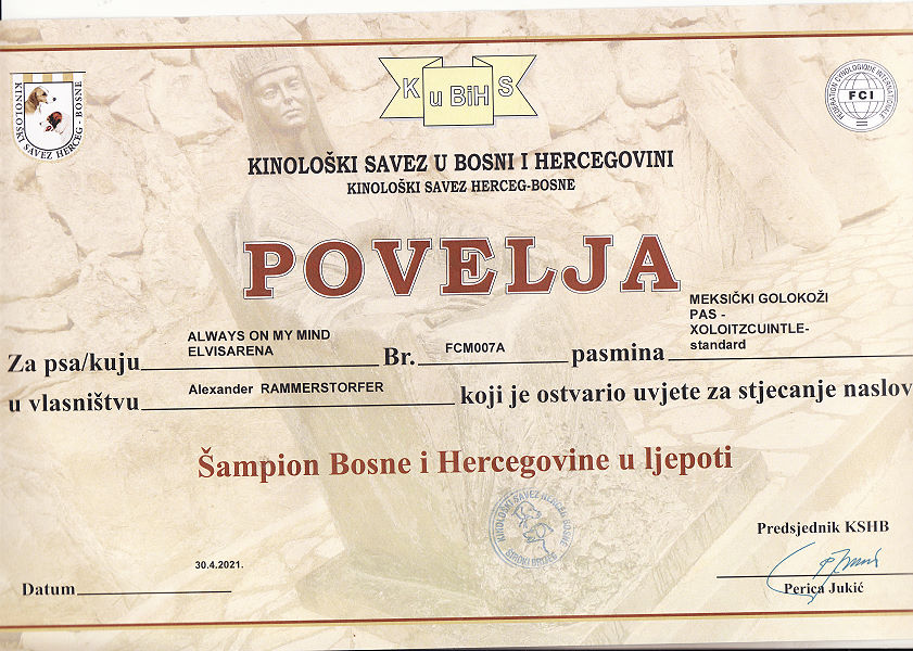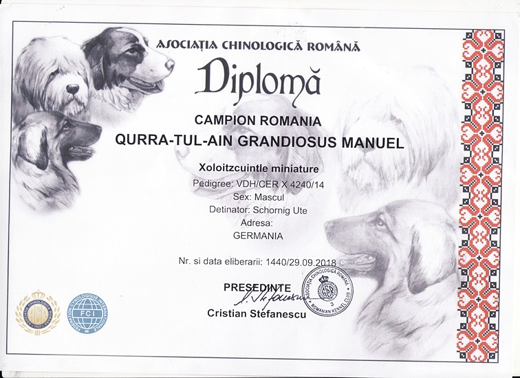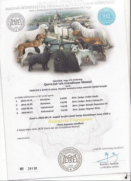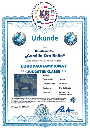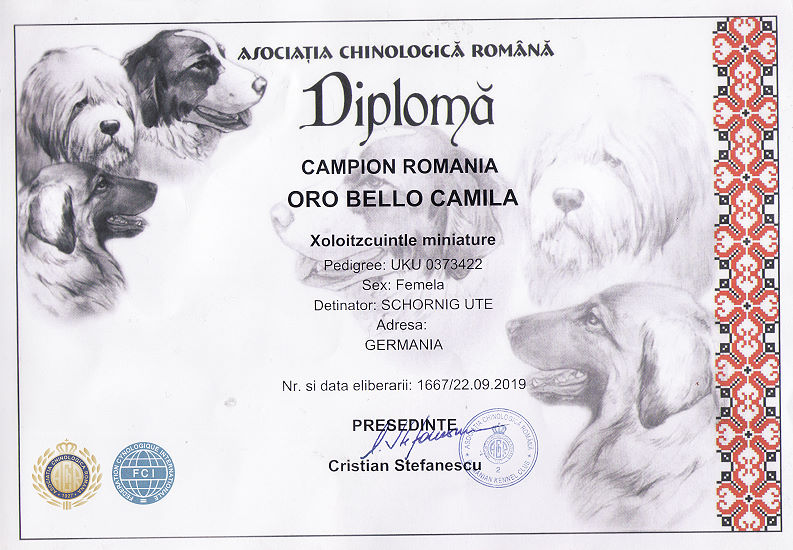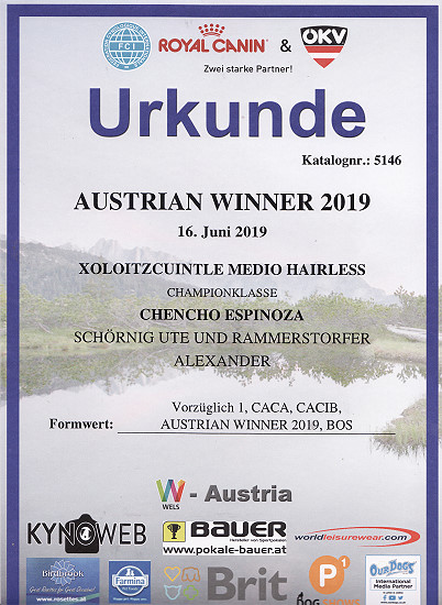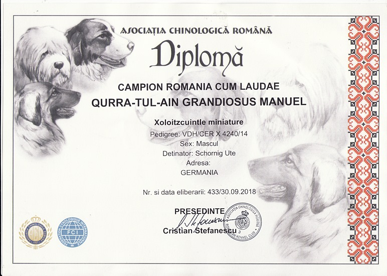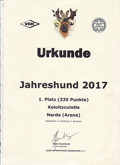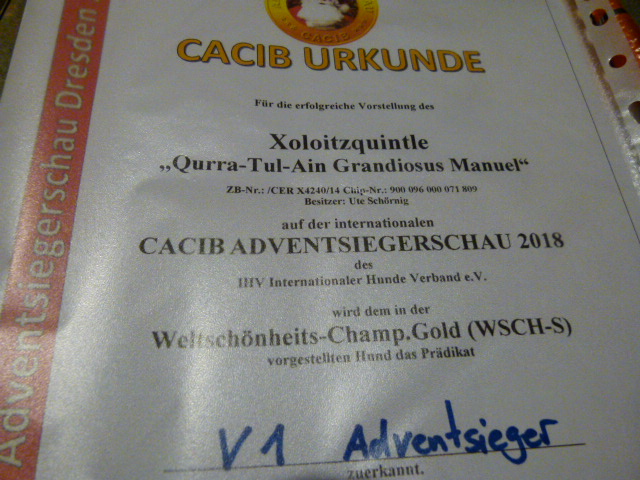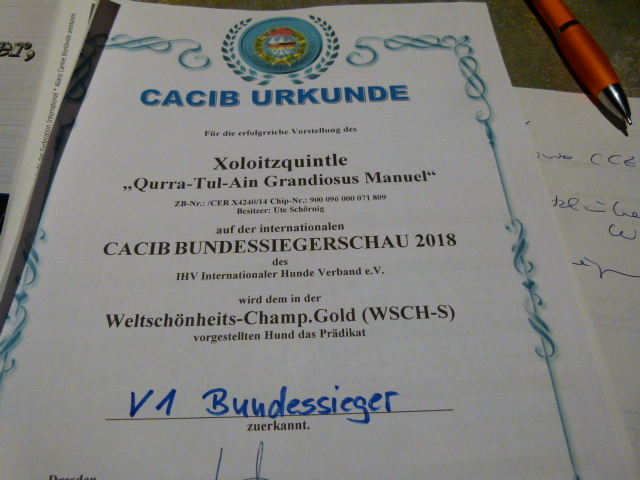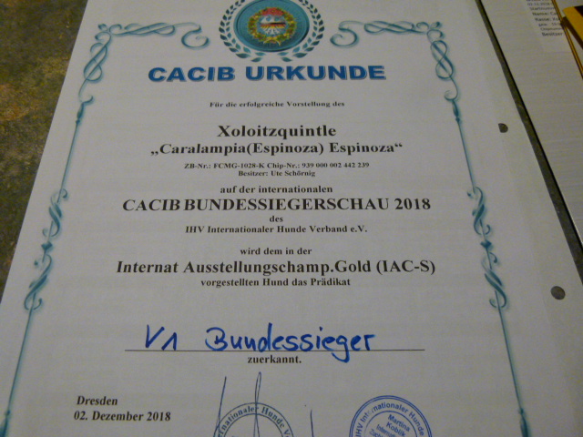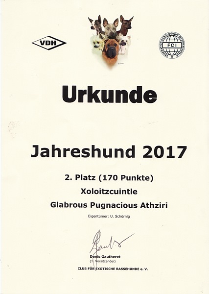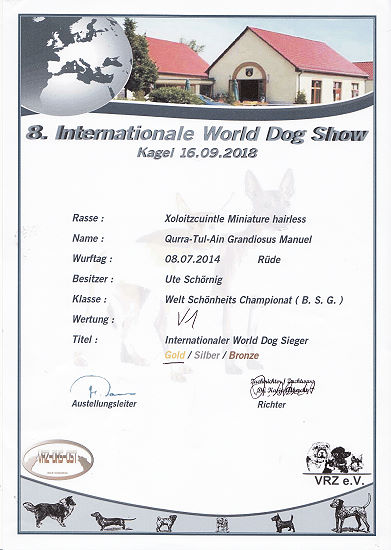 | Rasse: Xoloitczuintle Miniature Breeder: Guilermo Espinoza Owner: Ute Schörnig und Oliver Rammerstorfer geboren: 07.07.2016 PL-frei Junior World Winners 2017 and Best Junior of Breed Dt.Jug-Ch. VDH/CER Jun.-Lux.-Ch. Bundes-Jugendsieger VDH 2017 Dt. Ch. VDH Titel und Dokumente: