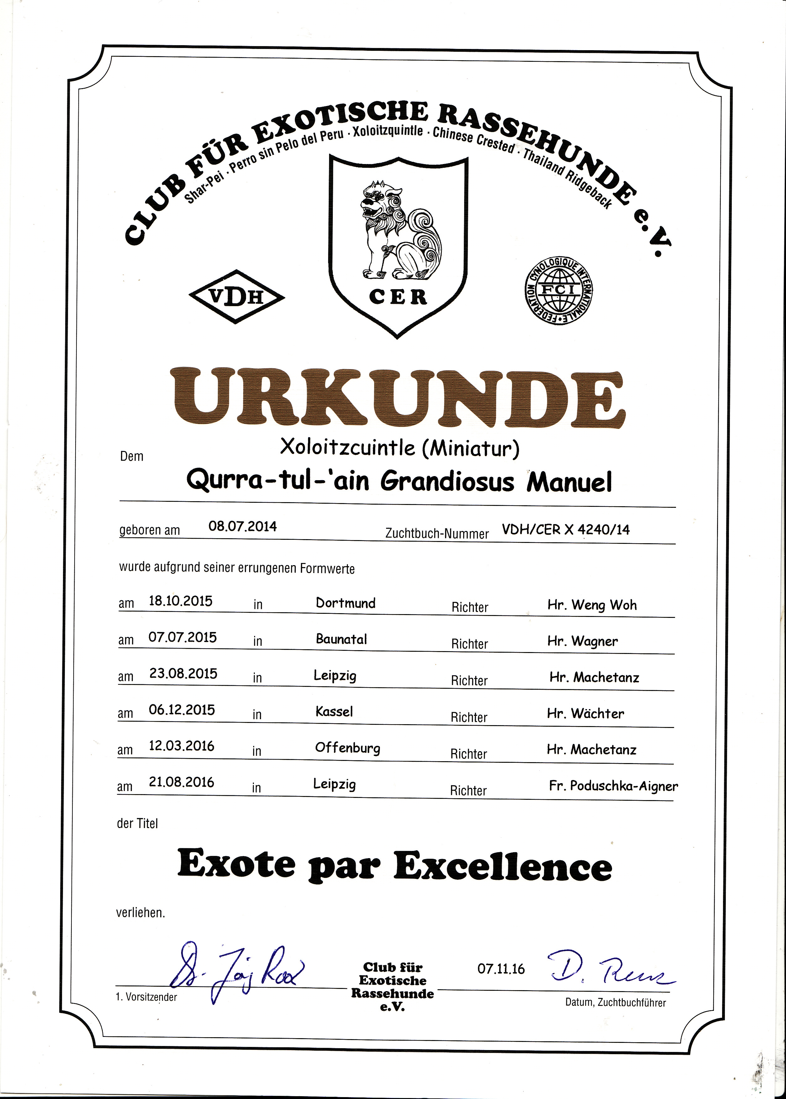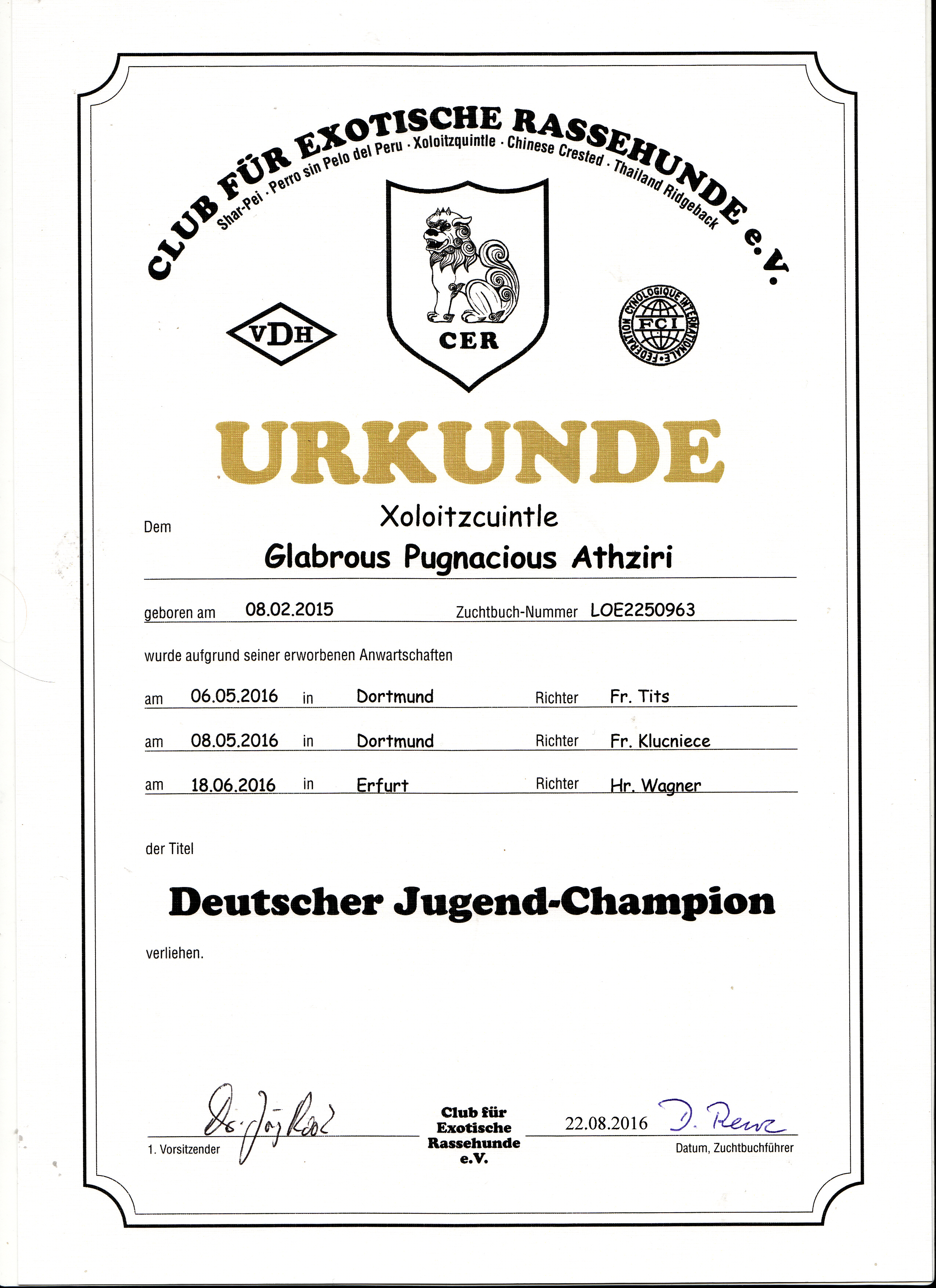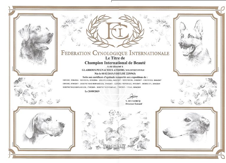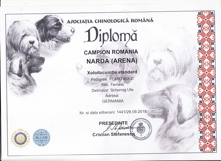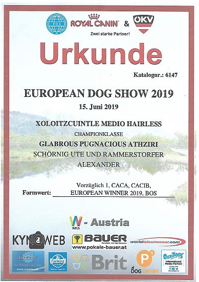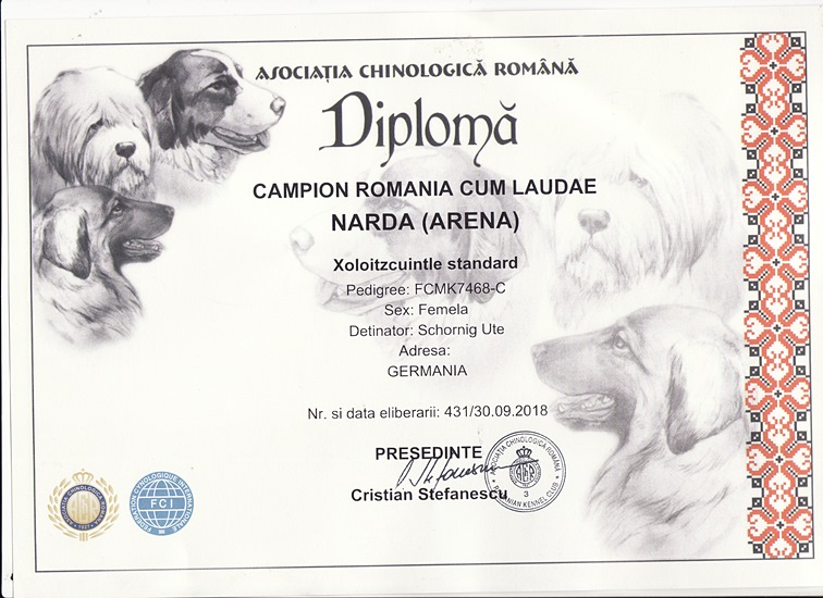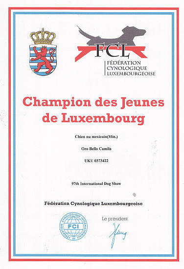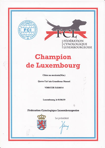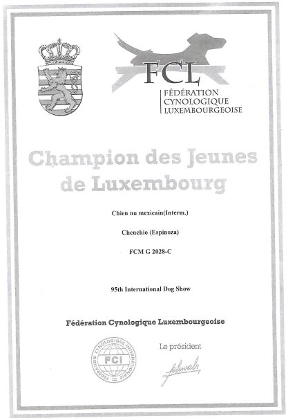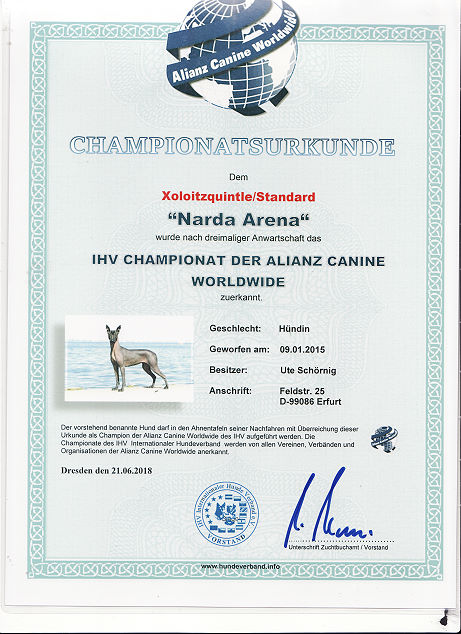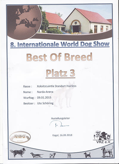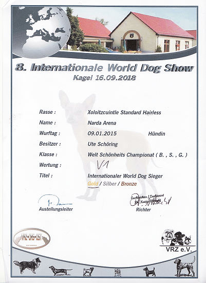 | Rasse: Xolo Standard Züchter: Alexandra Minoewa/Russland WT: 29.06.2013 ZTB ohne Auflagen Besitzer: Weber Jugendeuropasiegerin Jugendchampion VDH / CER Europajugendsiegerin 2014 Jugendclubsiegerin CER 2014 Jugenchampion Luxemburg Luxemburg Champion |