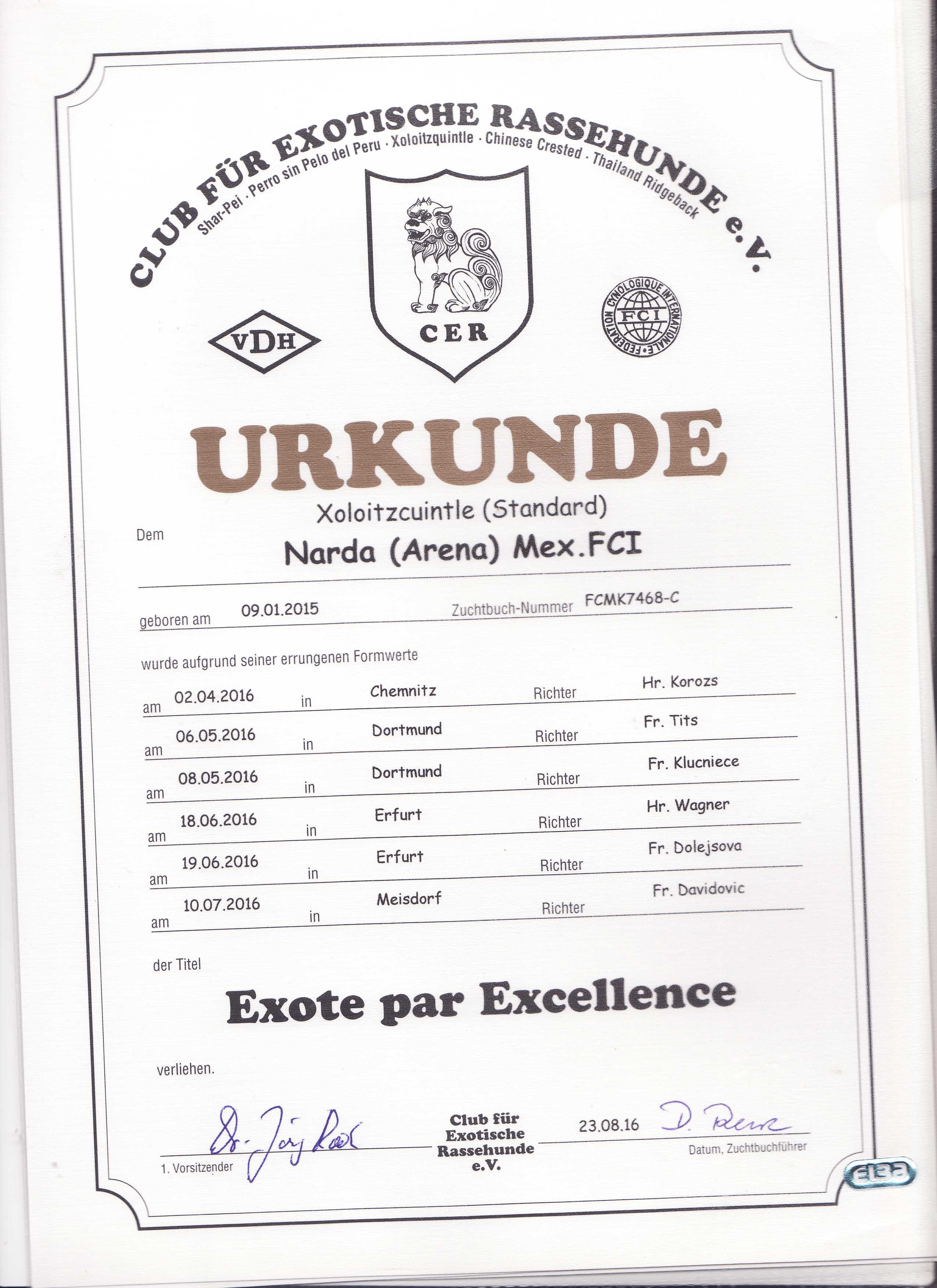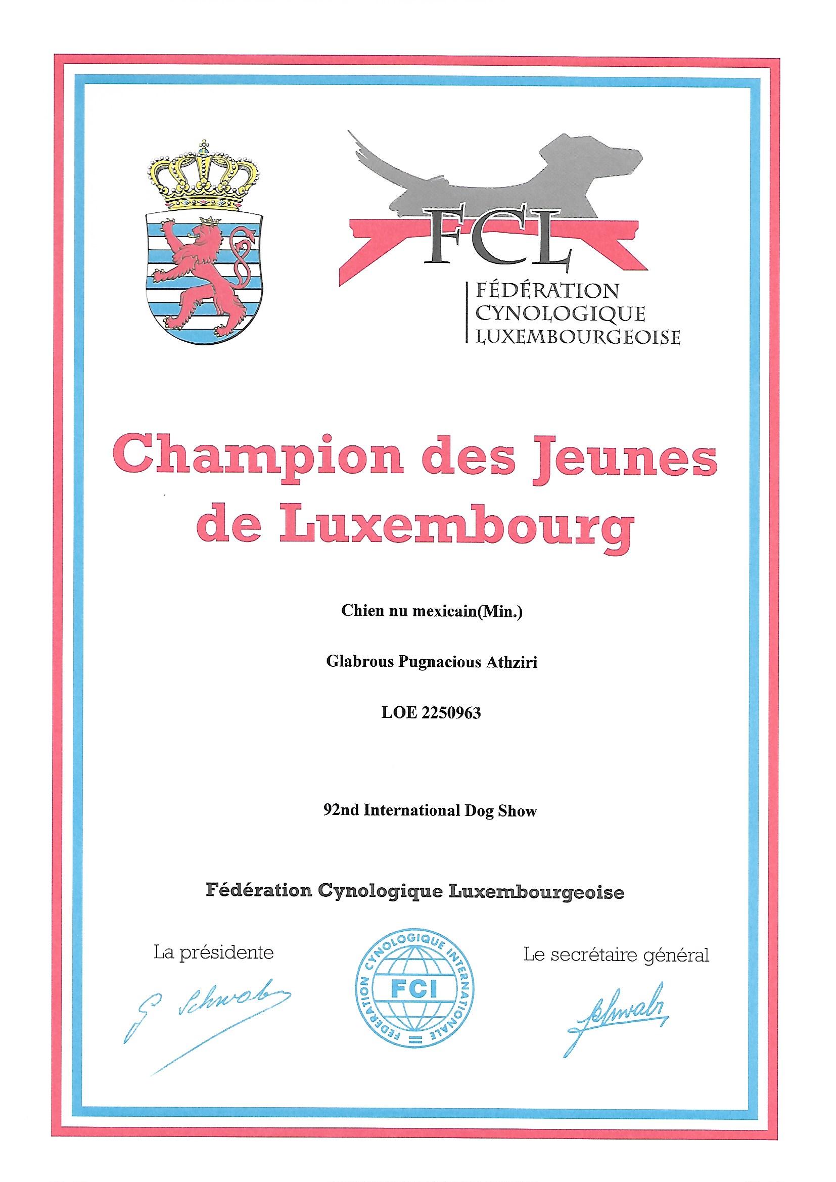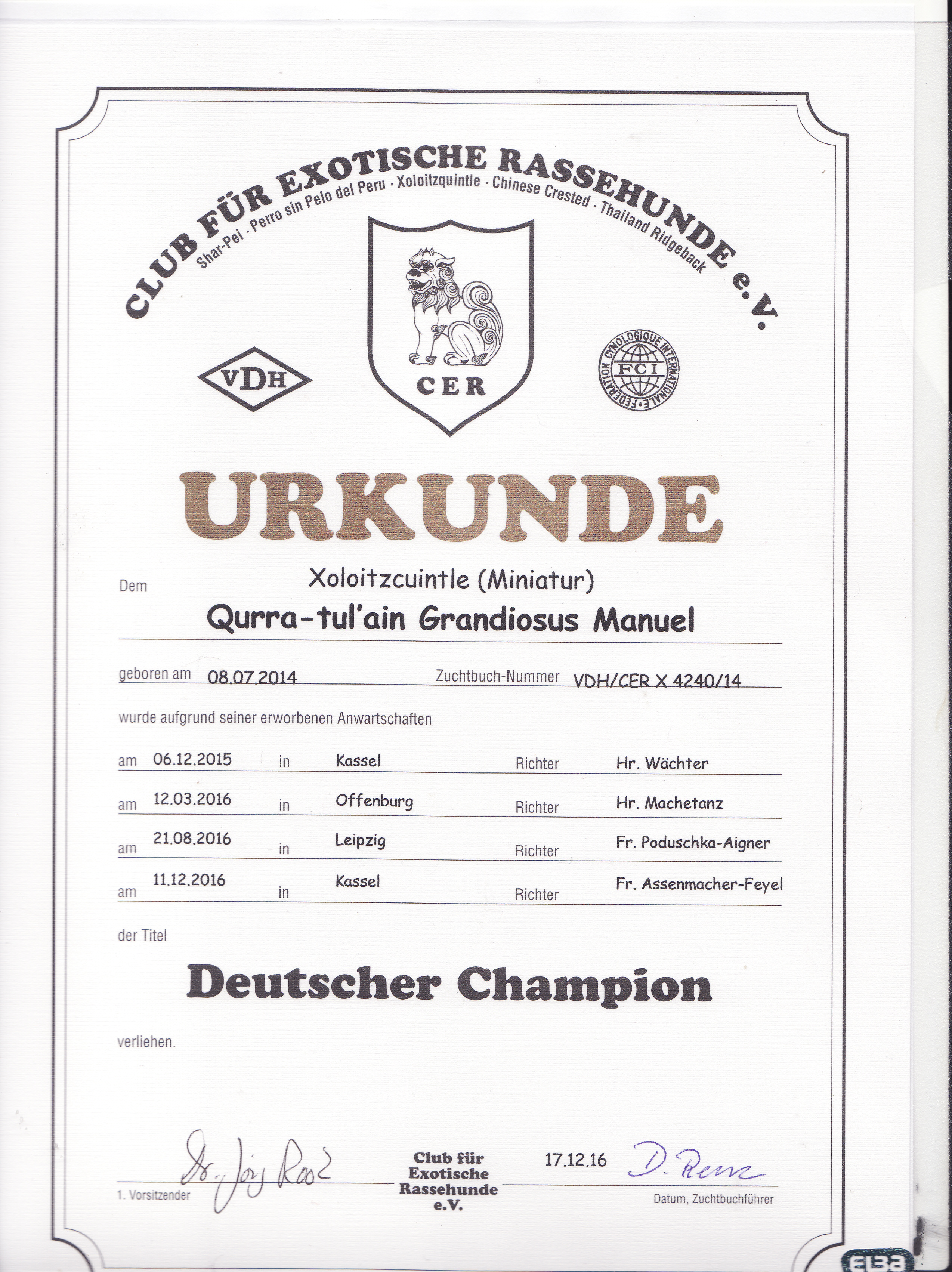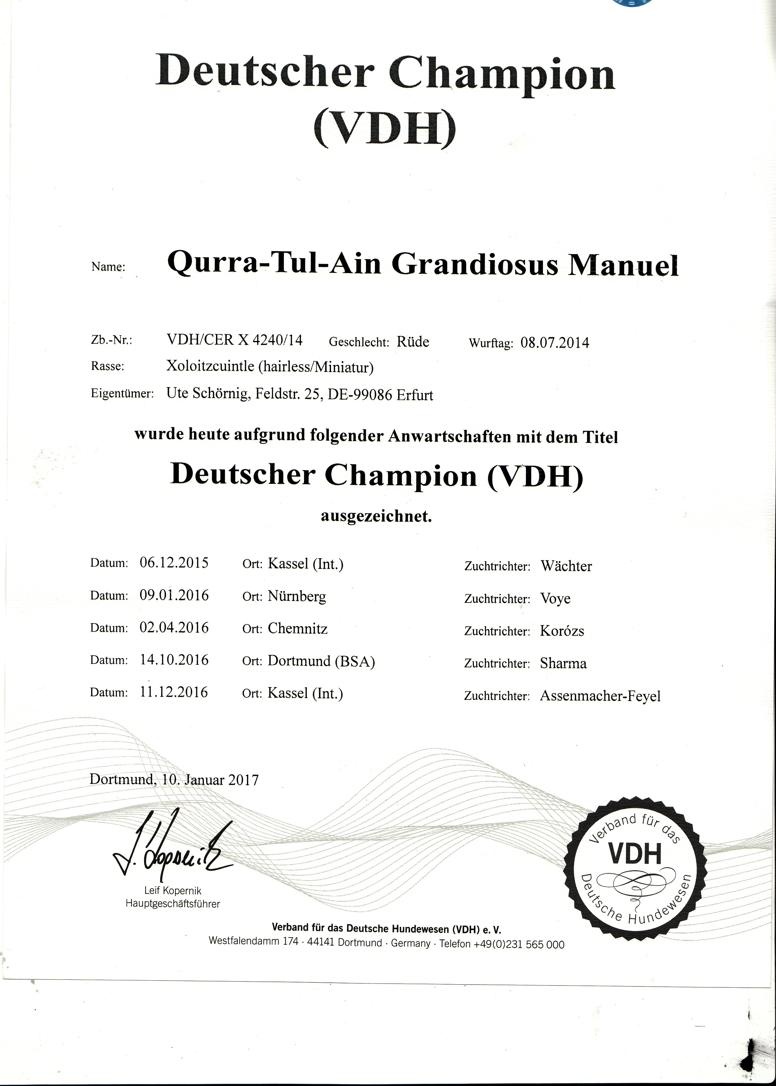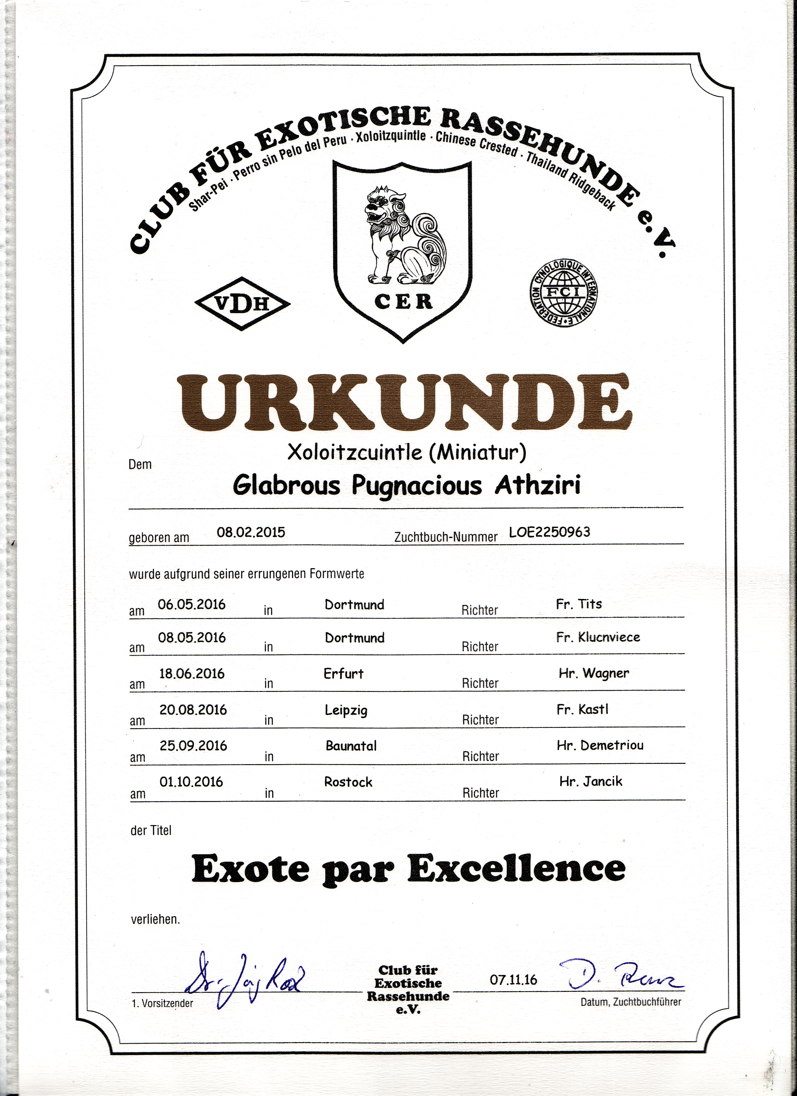| Rasse: Xolo Standard Züchter: Alexandra Minoewa/Russland WT: 29.06.2013 ZTB ohne Auflagen Besitzer: Weber Jugendeuropasiegerin Jugendchampion VDH / CER Europajugendsiegerin 2014 Jugendclubsiegerin CER 2014 Jugenchampion Luxemburg Luxemburg Champion |