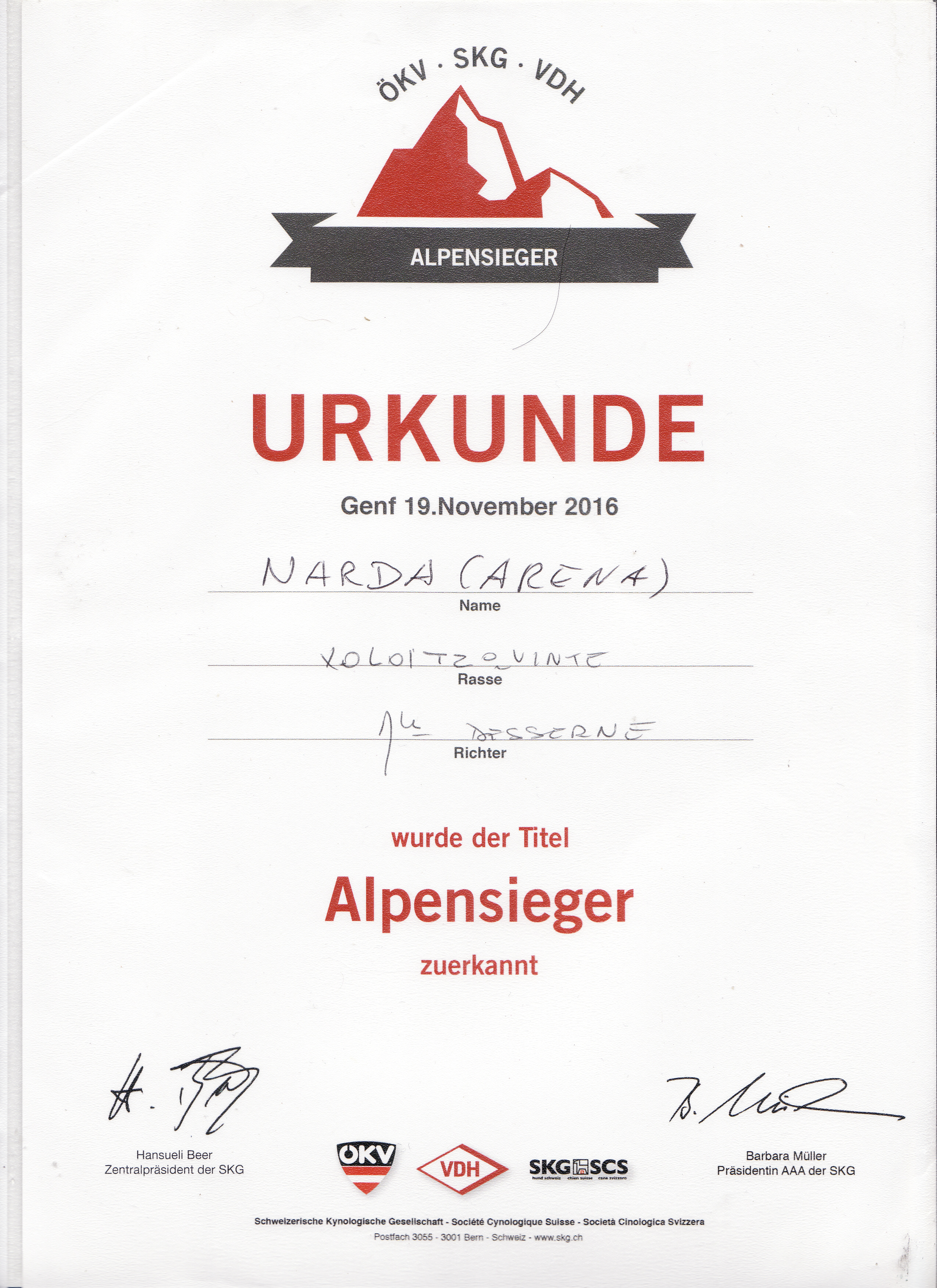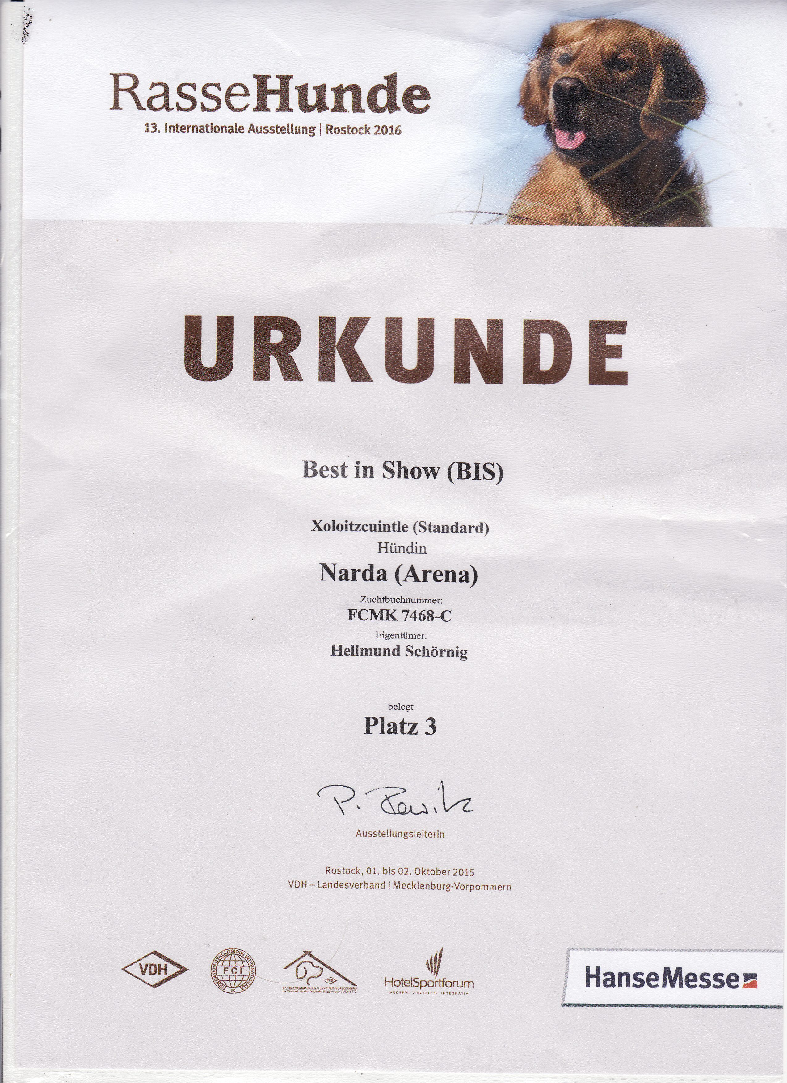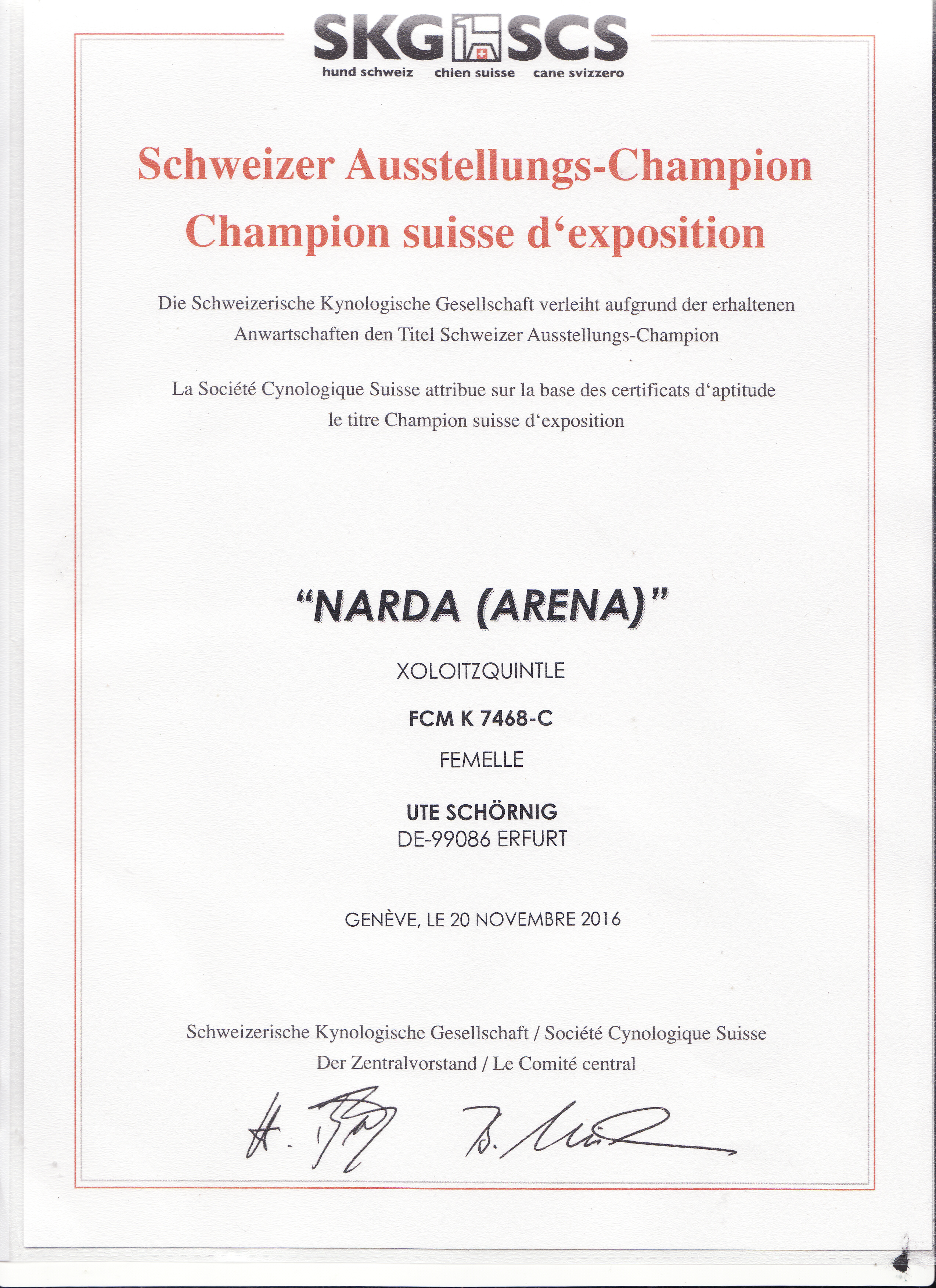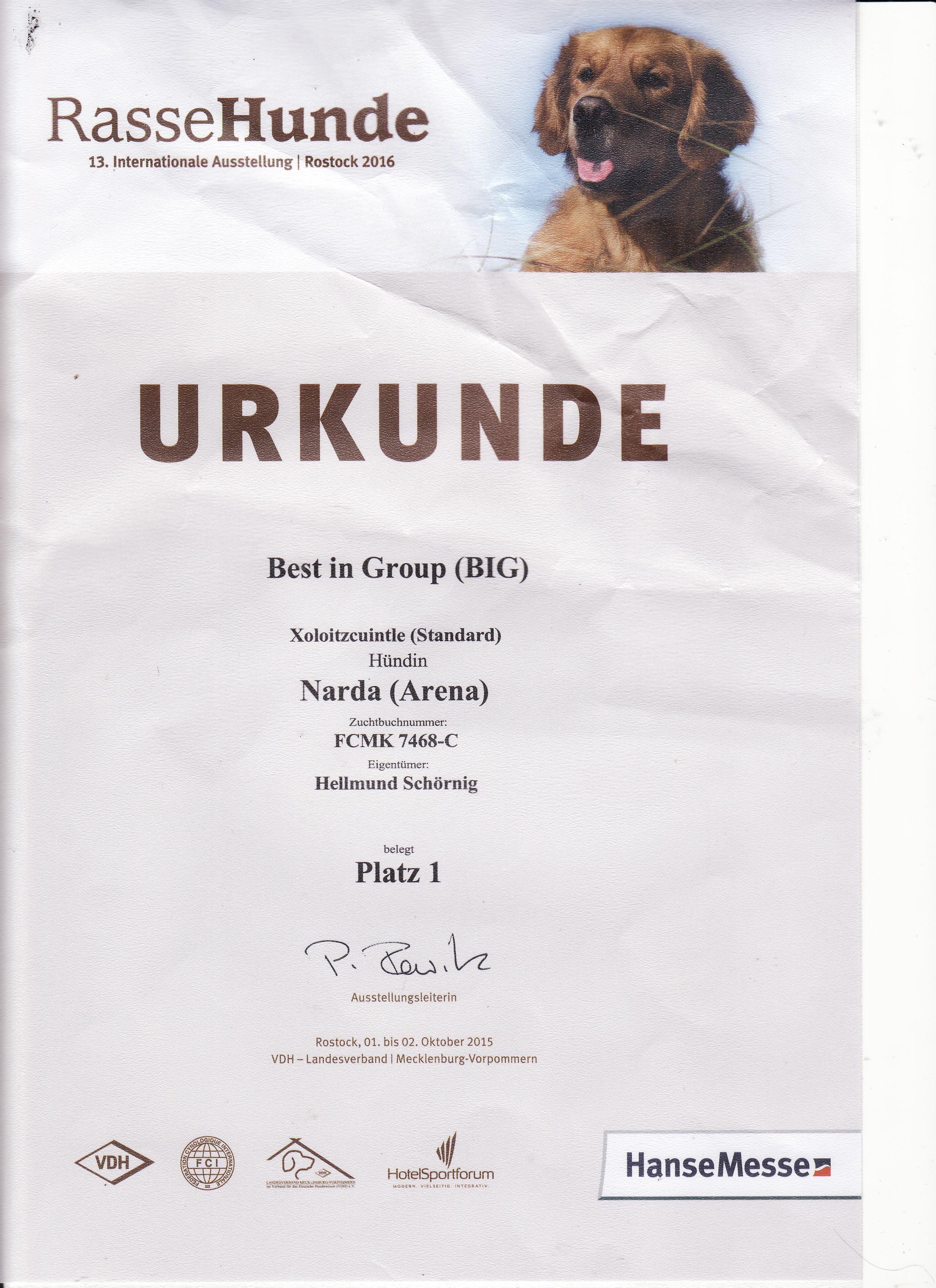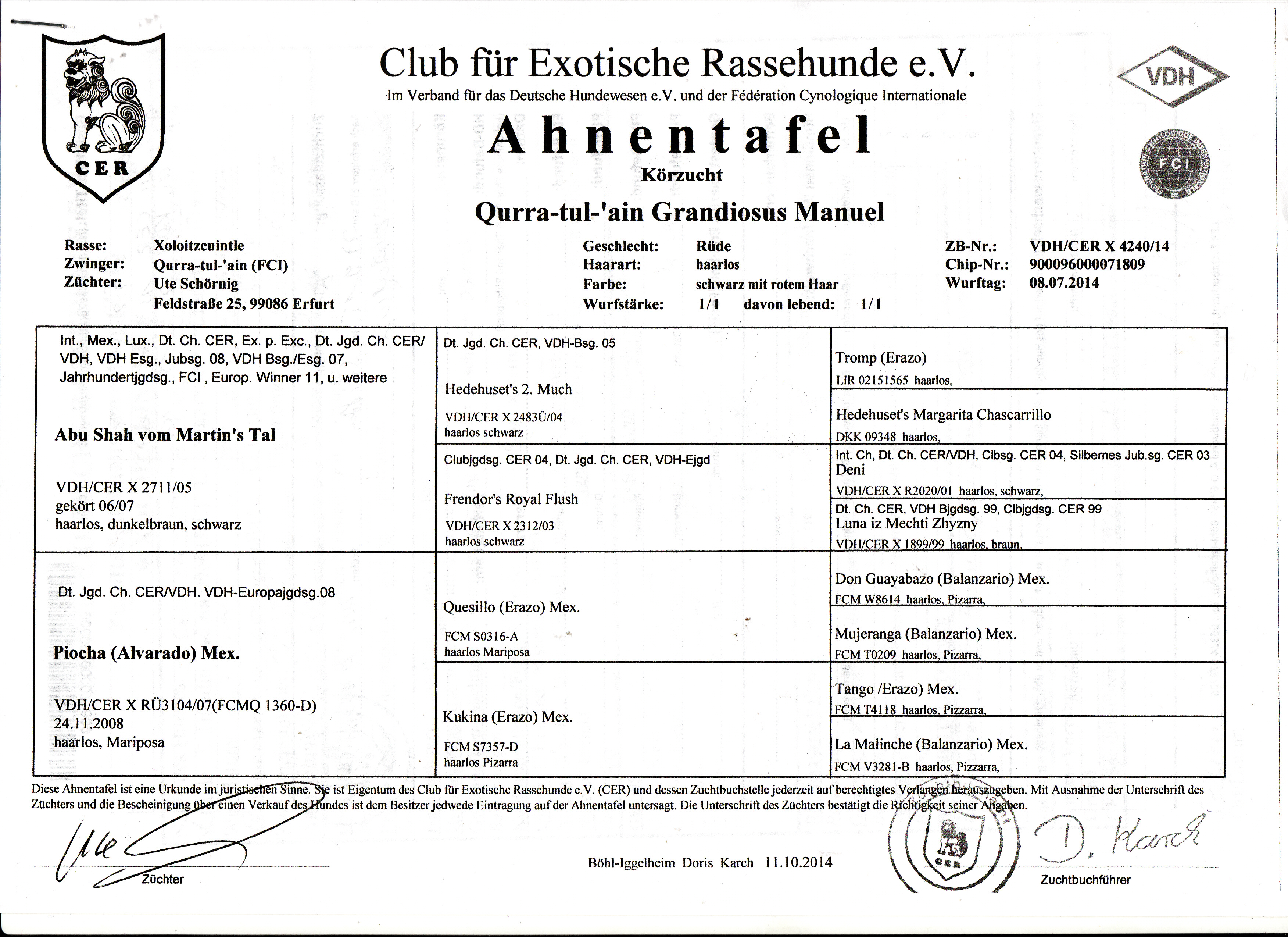 | Rasse: Xolo Standard Züchter: Alexandra Minoewa/Russland WT: 29.06.2013 ZTB ohne Auflagen Besitzer: Weber Jugendeuropasiegerin Jugendchampion VDH / CER Europajugendsiegerin 2014 Jugendclubsiegerin CER 2014 Jugenchampion Luxemburg Luxemburg Champion |
