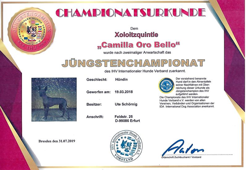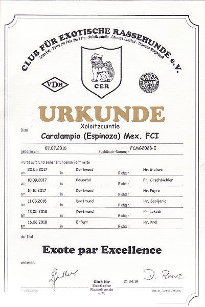 | Rasse: Xolo Standard Züchter: Dr. Hugo Fernando Gutierrez WT: 10.05.2009 Hündin ZTB bestanden ohne Einschränkung Landesjugendsiegerin Thüringen 2010 Deutscher Jugendchampion VDH Dt. Champion VDH Dt. Champion CER Exote par Excellence Veteranen Weltsieger 2017 Dt. Vet. Champion Veteranen-Bundessieger Titel und Dokumente: |