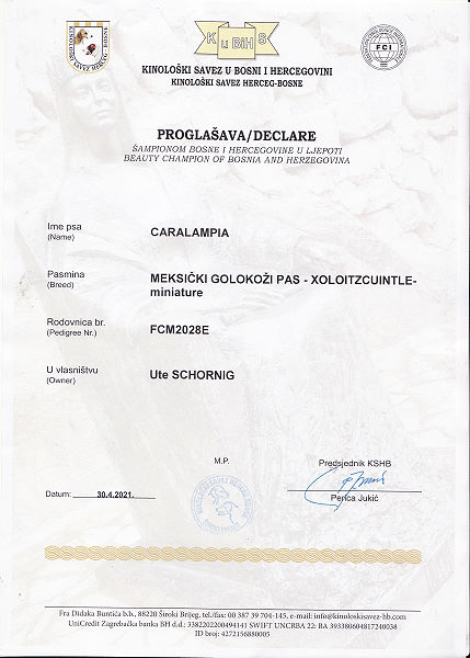 ![]() | Xoloitzcuintle Miniature Breeder: Ute Schörnig Owner: A.Rammerstorfer PL frei uneingeschränkt zuchttauglich CER Dt., Poln., Lux., Ung. Champion, Internat. Schönheits Ch. FCI Titel und Dokumente: | |
